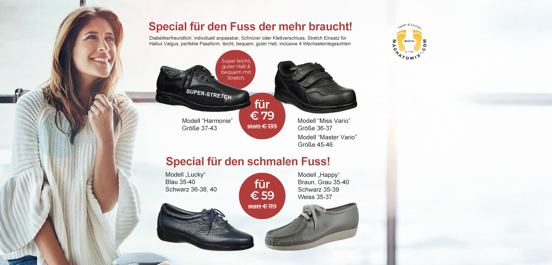 Auch Problemfüße fühlen sich in den Sandalen, Slippern, Schnürschuhen, Sport- und Freizeitschuhen besonders wohl. Eine Wohltat für Ballen, Hallux, Hammerzehe oder Hühneraugen. Höchster Tragekomfort durch anatomisch geformtes Fußbett.
